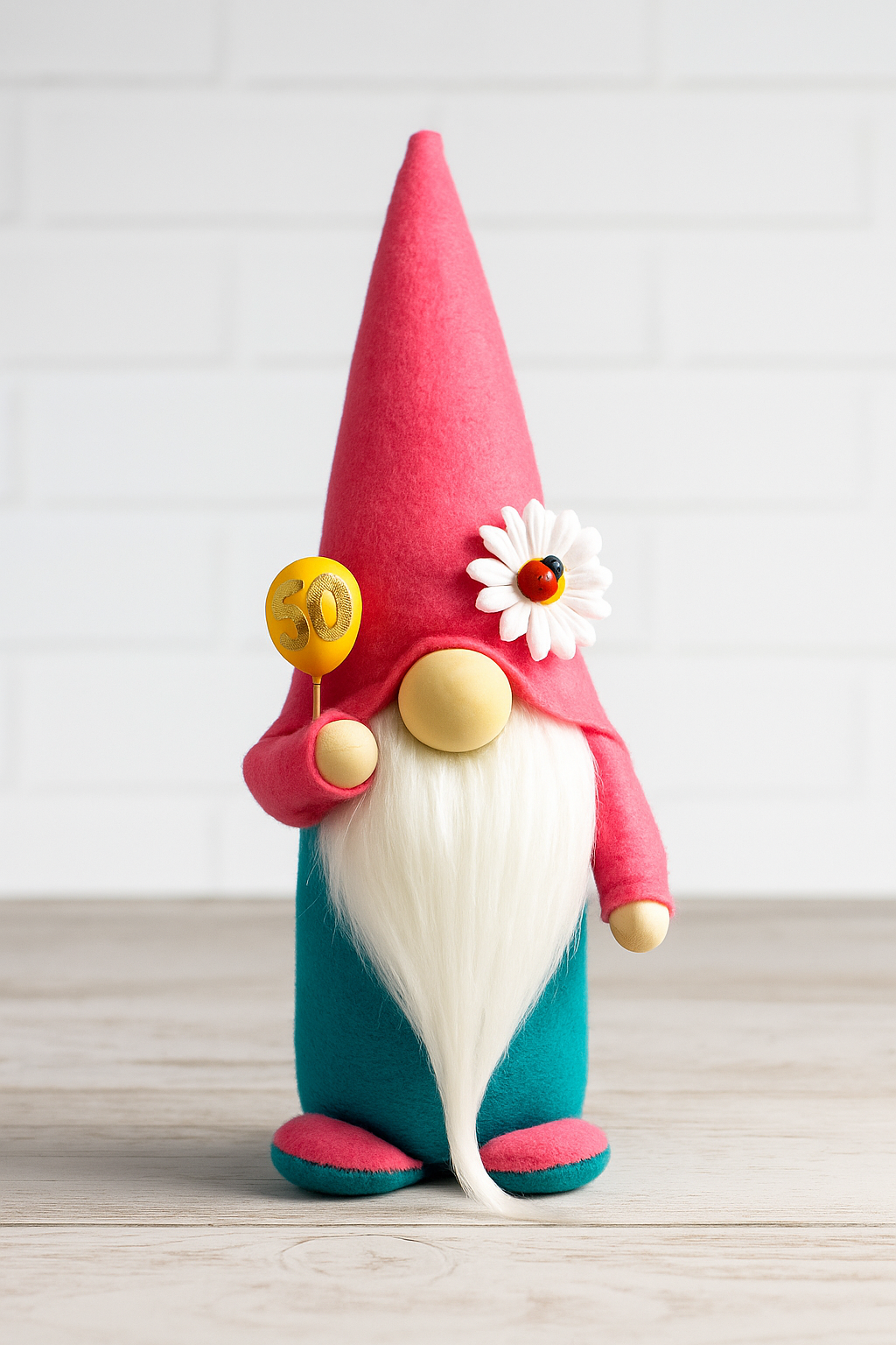 Norris measures 10inches from top to bottom, including his hat. He has a green felt body and a bright pink felt elf hat with Daisy and ladybug attached. Norris has a white beard and cute little shoes, and is clutching to balloon with the Number 50 on it. The balloon number can be changed to any age. If the age you require is not shown please add it to the age box above.
